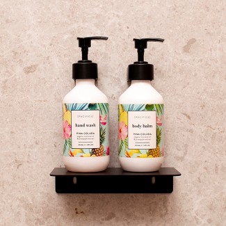 Lockable, they are tamper and theft proof they are made from 2 parts, DISPENSER15, individual bottle collars and a DISPENSER16, a black anodized aluminium shelf designed to hold two bottles comfortably, are designed to outlast most bathroom decor.