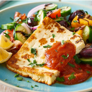 Place salad on serving plates and drizzle with KNORR Italian Glaze with Balsamic and olive oil. Top with haloumi schnitty and spoon over tomato sauce. Serve immediately with lemon wedges.