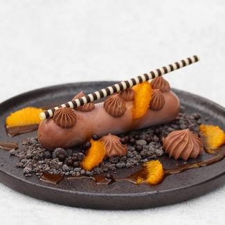 2. Pipe into 2x Silikomart Finger 75 and push in a the Orange Panna Cotta in each mould. Remove excess mousse and freeze. Save the leftover mousse to pipe on dessert.