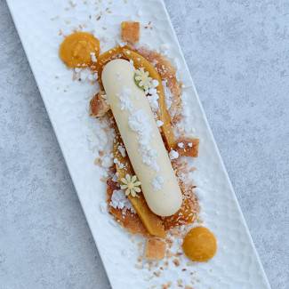 4. Arrange sliced mango on a plate, add a Vanilla or coconut sponge in the base and cut some pieces as decoration.